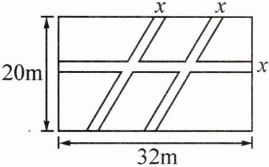2. 如图,在一块长32m、宽20m的矩形地面上修建三条入口宽度相等的小路,每条小路的两边是互相平行的,且其中一条小路与矩形地面的一边平行.若使剩余部分的面积为570m²,则小路的入口宽度为