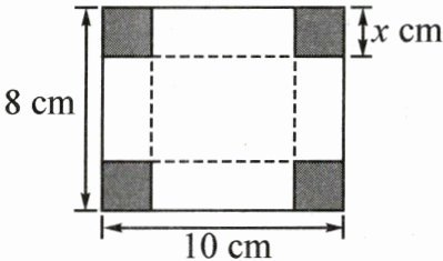 4. 如图,长方形铁皮的长为10 cm,宽为8 cm,现将它的四个角上剪去边长为x cm的正方形,做成底面积为$24cm^{2}$的无盖长方体盒子,则x的值为(