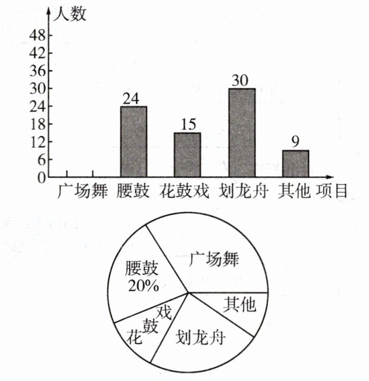 补充条形统计图:广场舞对应的条形高度为$42$(画图略)。