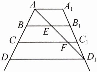 4. 如图是一架梯子的示意图,其中$AA_{1}// BB_{1}// CC_{1}// DD_{1}$,且$AB=BC=CD$.为使其更稳固,在A,$D_{1}$之间加绑一条安全绳(线段$AD_{1}$),量得$AE=0.4m$,则$AD_{1}=$