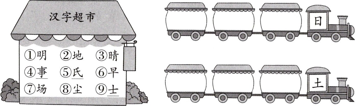 1. 给汉字超市里未画线的汉字分类,将其送上小火车。