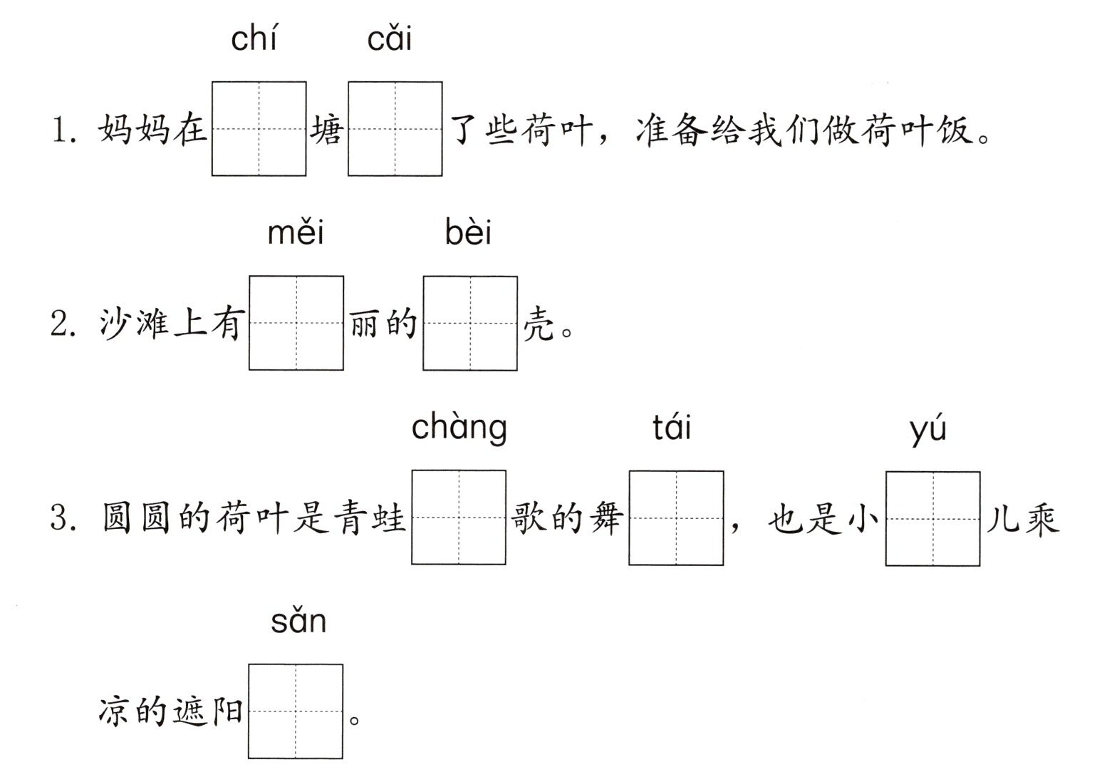 1. 池 采 2. 美 贝 3. 唱 台 鱼 伞