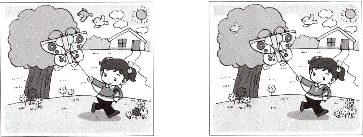 左边树上鸟的数量、空中飞鸟的数量、树旁花的数量和分布。