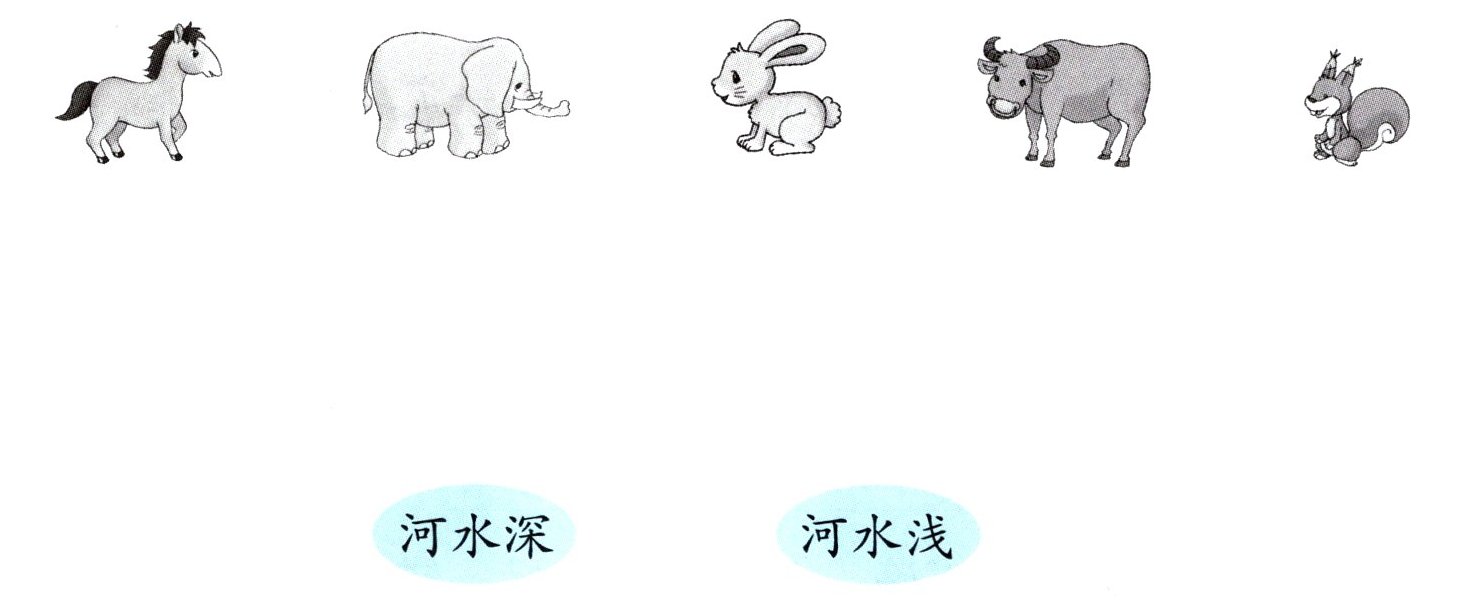 一、下面这些动物如果一起过半米深的河,会觉得河水是深还是浅呢?连一连。