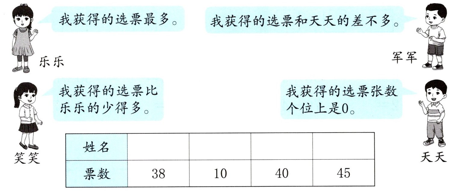 6. 下面是4个小朋友获得选票的情况,请根据对话在对应的票数上面写上他们的名字。