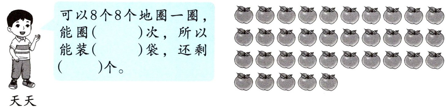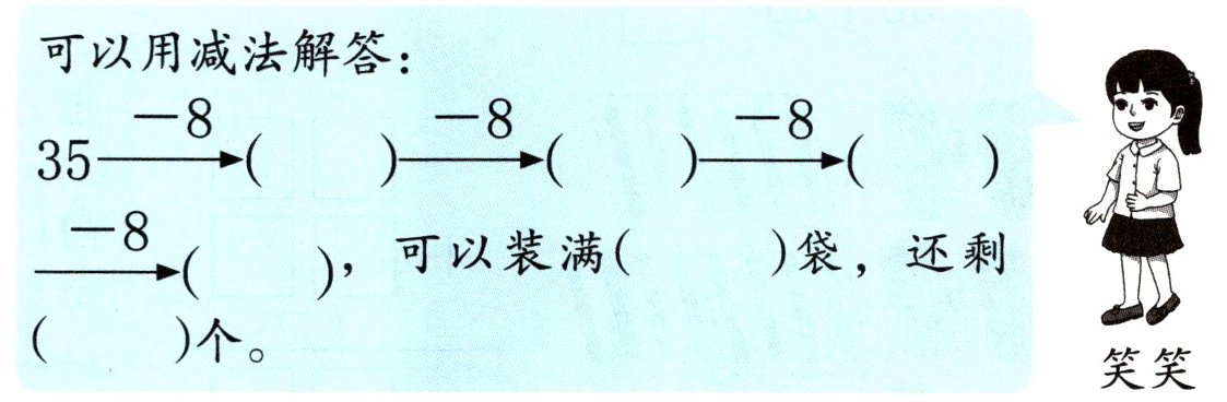 5. 有35个苹果,8个装一袋,可以装满几袋? 还剩几个?