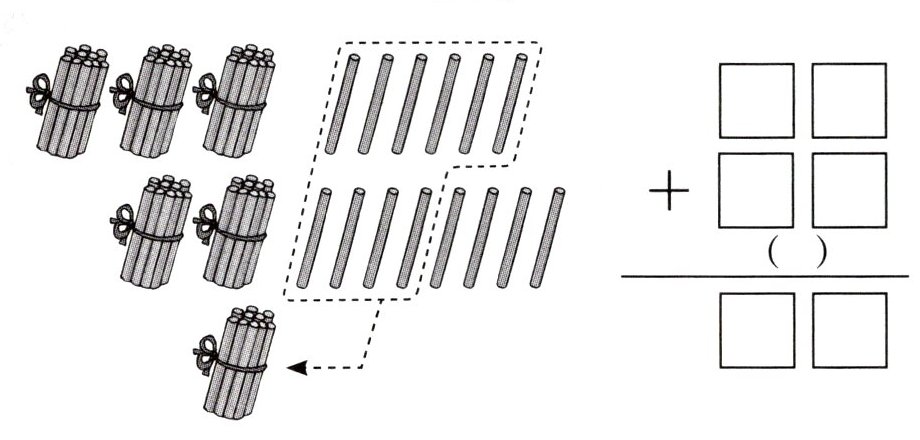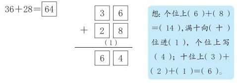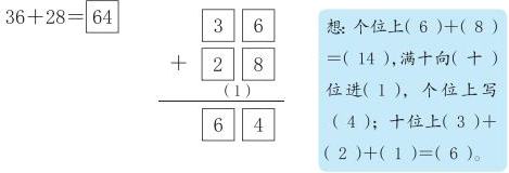 想:个位上$( ) + ( ) = ( )$,满十向$( )位进( )$,个位上写$( )$;十位上$( ) + ( ) + ( ) = ( )$。