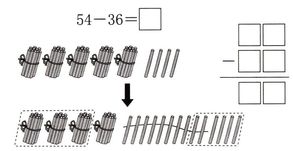 想:个位上(4)减(6)不够减,从十位退(1)是(10),(10)加(4)得(14),个位上算(14)-(6)=(8),十位上算(5)-(1)-(3)=(1)。