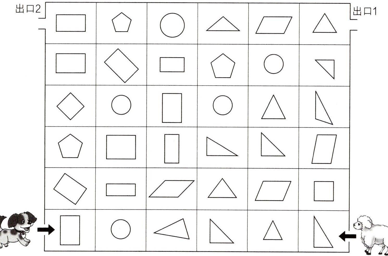 小狗和小羊比赛走迷宫,小狗只能沿着含有“长方形”标识的方格走,小羊只能沿着含有“三角形”标识的方格走(只能向上、左、右走),你能帮助小狗和小羊成功走出迷宫吗?试着画一画吧!