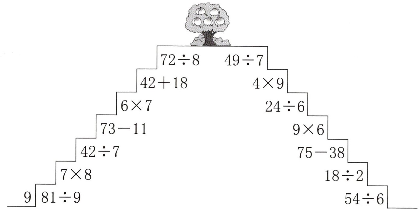 1. 上台阶,摘桃子。(照样子,在台阶上写得数)