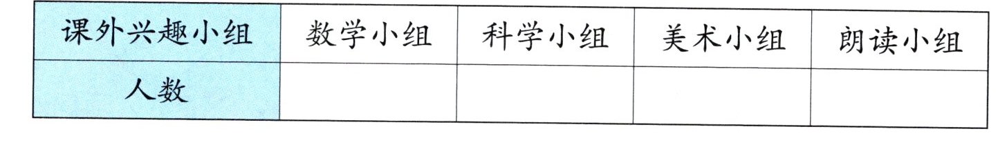 (4)我最喜欢这四个课外兴趣小组中的( )小组,参加这个课外兴趣小组的有( )人。