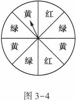 11.图3-4所示的是一个转盘。转盘被分成8个相同的图形,颜色分为红、绿、黄三种。指针的位置固定,转动转盘后任其自由停止,其中的某个扇形会恰好停在指针所指的位置(指针指向两个图形的交线时,当作指向右边的图形)。求下列事件的概率: