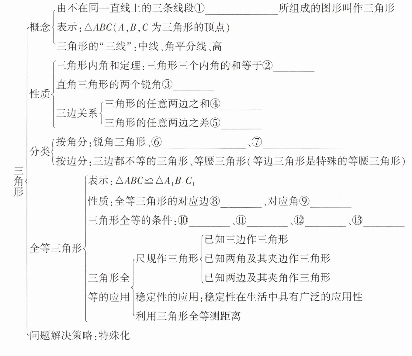答案: ①首尾顺次相接;②180°;③互余;④大于第三边;⑤小于第三边;⑥直角三角形;⑦钝角三角形;⑧相等;⑨相等;⑩SSS;⑪SAS;⑫ASA;⑬AAS