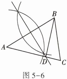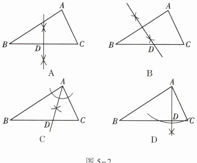 4. 如图 5 - 2,通过如下尺规作图,能确定 $ D $ 是 $ B C $ 边中点的是 (