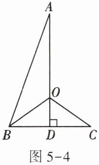 7. 如图 5 - 4,$ A D \perp B C $ 于点 $ D $,$ D $ 为 $ B C $ 的中点,连接 $ A B $,$ \angle A B C $ 的平分线交 $ A D $ 于点 $ O $,连接 $ O C $。若 $ \angle A O C = 125 ^ { \circ } $,则 $ \angle A B C $ 的度数为
