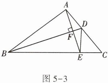 5. 如图 5 - 3,$ B D $ 是 $ \triangle A B C $ 的角平分线,$ A E \perp B D $,垂足为 $ F $。若 $ \angle A B C = 35 ^ { \circ } $,$ \angle C = 50 ^ { \circ } $,则 $ \angle C D E $ 的度数为 (