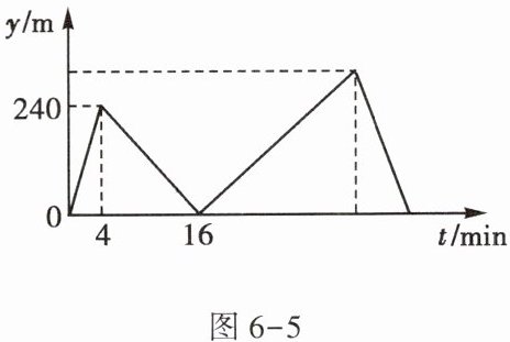 6. 甲、乙两人在笔直的公路上同起点、同终点、同方向匀速步行2400m,先到终点的人原地休息。已知甲先出发4min,在整个步行过程中,甲、乙两人之间的距离y与甲出发的时间t之间的关系如图6-5所示,有下列结论:①甲步行的速度为60m/min;②乙走完全程用了32min;③乙用16min追上甲;④乙到达终点时,甲离终点还有300m。其中正确的结论有 (