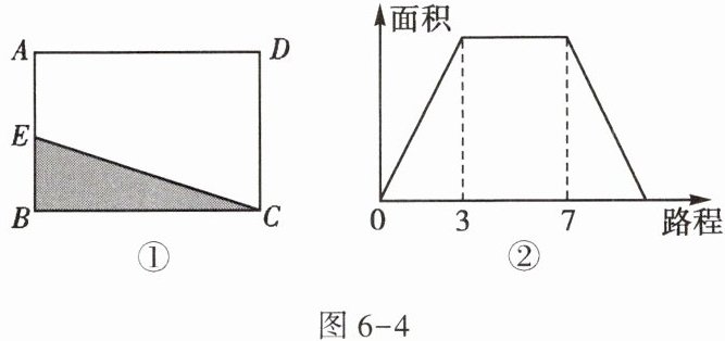 5. 如图6-4①,在长方形ABCD中,动点E从点B出发,沿$ B \to A \to D \to C $方向运动至点C处停止,如果$ \triangle BCE $的面积与点E运动的路程的关系图象如图6-4②所示,那么当路程为7时,点E应运动到 (
