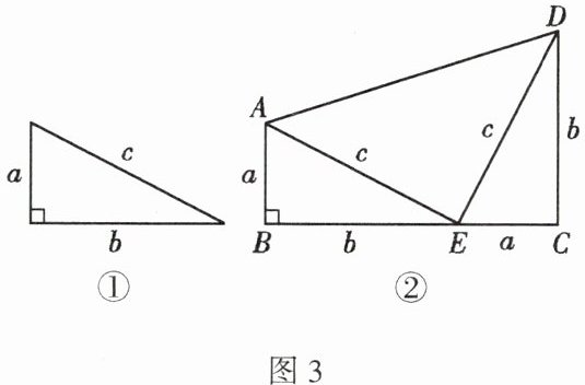 (2)以图3①中的直角三角形为基础,可以构造出以a,b为底,以$ a + b $为高的直角梯形(如图3②),请你利用图3②验证勾股定理。