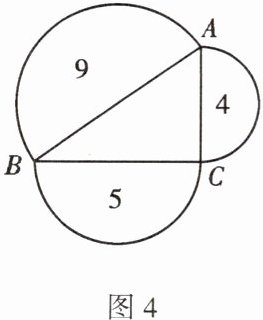 7. 如图4,分别以△ABC的三边为直径向外作3个半圆,它们的面积分别为4,5,9,则△ABC____