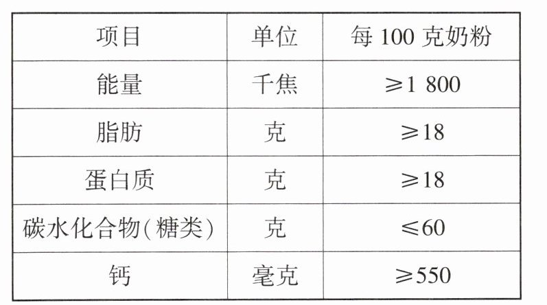 1. 下表所示为某品牌奶粉的营养成分表(碳水化合物即糖类),每 100 克该奶粉中具有超过 1 800 千焦能量,这些能量不可能来自 (