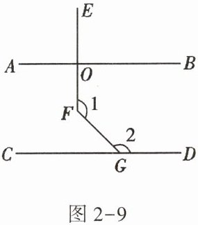 13. 如图2-9,$AB// CD$,$EF\perp AB于点O$,$\angle 2 = 135^{\circ}$,求$\angle 1$的度数。
