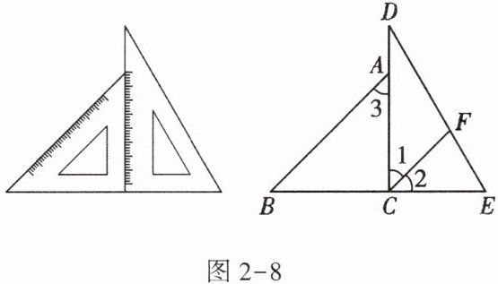 12. 将一副三角板拼成如图2-8所示的图形,过点$C作CF平分\angle DCE交DE于点F$。