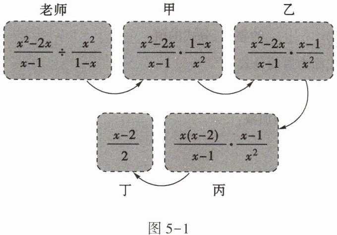 4. 老师设计了接力游戏,用合作的方式完成分式化简,规则是:每人只能看到前一人给的式子,并进行一步计算,再将结果传递给下一人,最后完成化简。过程如图 5 - 1 所示: