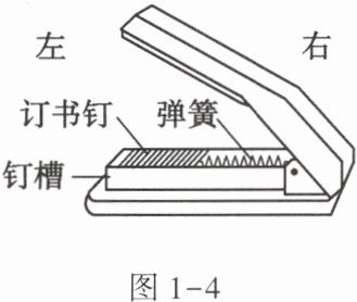 4. 如图 1-4 是一种常见的订书机,钉槽内的订书钉之所以不会松脱,是因为固定在槽内后部的弹簧给订书钉一个向