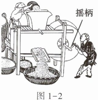 2. 如图 1-2 是元代王祯《农书》中描绘的农民使用扇车清选谷物的情景。农民快速摇动摇柄,扇轮转动产生气流,当把谷物倒入扇车时,谷物在