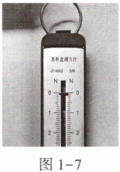 8. 如图 1-7 所示,弹簧测力计未挂重物时指针在零刻度线下方,在使用它测量钩码重力之前,应该先(