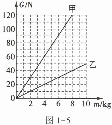 5. 小明在科技博览阅读中,查阅了不同星球上重力与质量的关系,如图 1-5 所示。通过图像可知,在甲、乙两个星球上,重力与质量都成