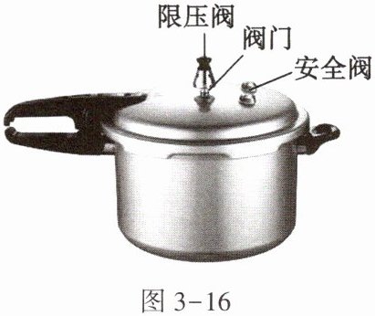 18. 如图 3 - 16 所示,高压锅的锅盖上有一个空心柱(排气孔),空心柱上“戴”着一个帽子(限压阀),当高压锅内气体的压强超过安全值时,其内的气体就会冲出限压阀,排出一部分,使锅内气体的压强减少。现有一个直径为 $ 24 \mathrm{cm} $、空心柱小孔的横截面积为 $ 10 \mathrm{mm}^{2} $、限压阀质量为 $ 100 \mathrm{g} $ 的高压锅,要用它来煮饭,若当时的大气压为 $ 1.0 × 10^{5} \mathrm{Pa} $。则:($ g $ 取 $ 10 \mathrm{N/kg} $)