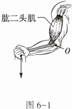 1. 如图6-1,人的前臂可以看成是以肘关节为支点的杠杆,当手提着物体匀速曲肘时,胳膊上的肱二头肌会对前臂施加一个动力,物体对前臂施加一个阻力,前臂这种结构的好处是