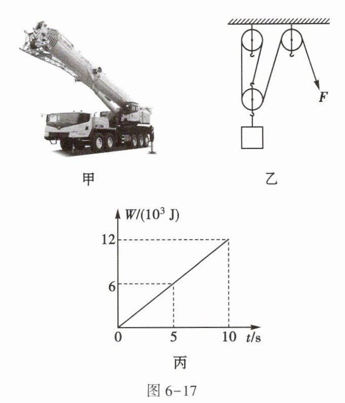 17. 修建房屋时,人们往往会利用起重机(如图6-17甲所示)来搬运质量较大的建筑材料,图6-17乙为起重机内部滑轮组的简易图。现用该起重机将质量为200kg的建筑材料以0.5m/s的速度向上拉起5m,绳子自由端的拉力F所做的功与时间的关系如图6-17丙所示,不计绳重和摩擦,g取10N/kg。求: