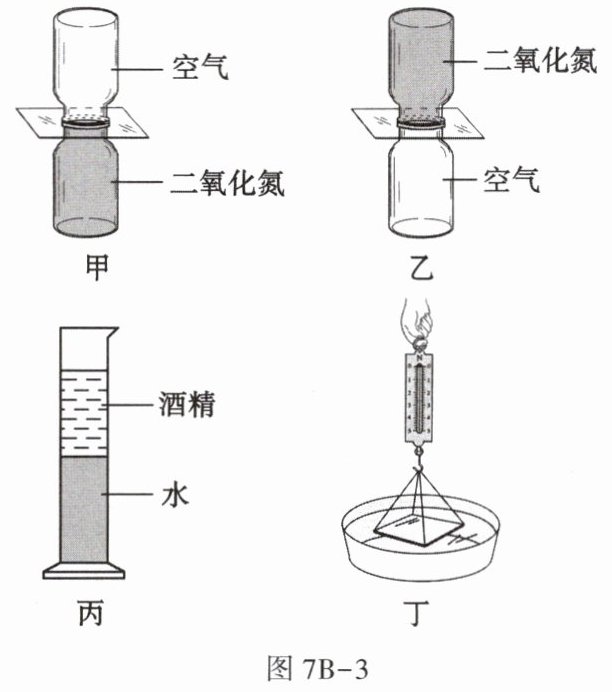 (1)图甲中,二氧化氮的密度大于空气密度,它运动到上面的瓶子内,说明气体分子在不停地做无规则运动;图乙中,密度大的二氧化氮气体在上方,抽去玻璃板后,由于重力的作用,二氧化氮气体会向下运动,所以不能完全说明气体分子在不停地做无规则运动。故更合理的是图甲。
