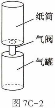 4. 礼宾花结构如图7C-2所示,当小李旋转纸筒时,气阀被打开,气罐里的压缩空气喷射而出,将纸筒内的彩纸屑和彩带喷射得高高的,形成了缤纷绚丽的景象。在喷出礼花彩条的过程中(