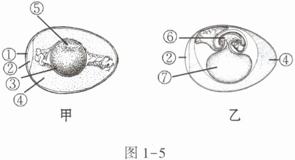 12. 图1-5中甲为鸡卵结构示意图,乙为鸡胚胎发育示意图。请据图回答。