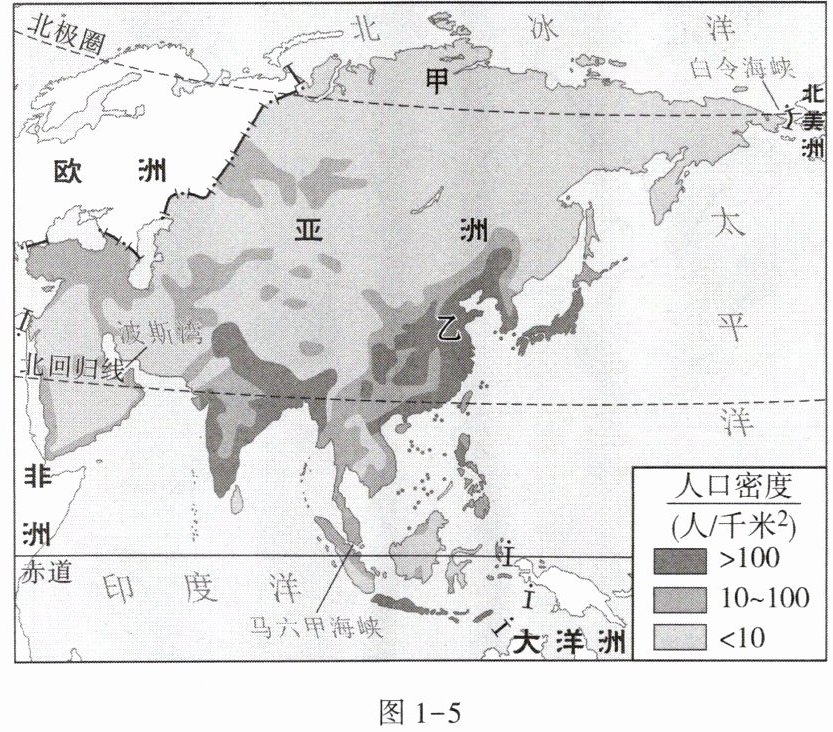 亚洲是世界上面积最广衰、人口最多的大洲,其人口分布不均,经济发展地区不均衡。图1-5为亚洲人口密度示意图。据此完成11~13题。