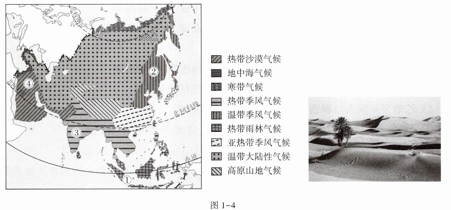 图1-4为亚洲气候类型分布示意图和该大洲某地景观图。据此完成8~10题。