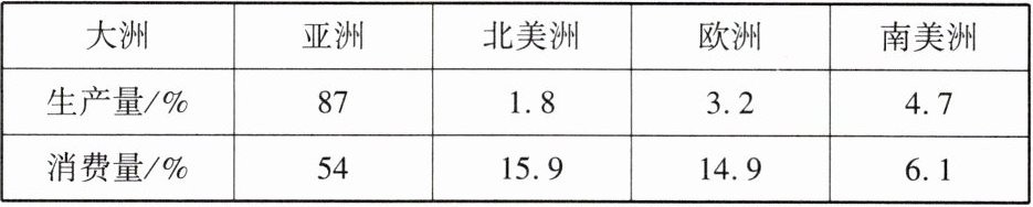 制鞋产业生产过程中需要大量的劳动力。下表为2022年世界部分大洲制鞋业生产量和消费量占全球的百分比。据此完成14~15题。
