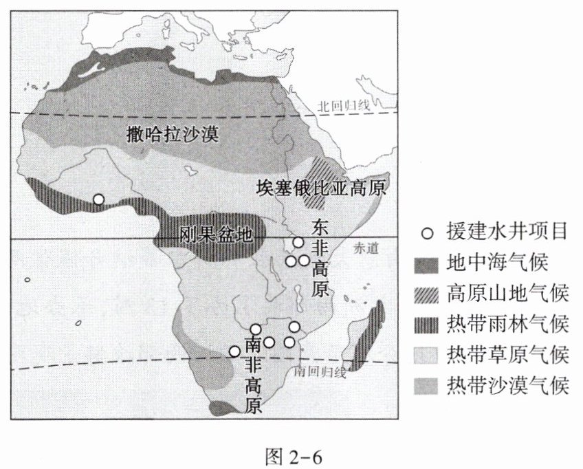 近年来,非洲部分国家市政供水面临困难,日常用水难以保障,中国政府为其援建水井约2000口。图2-6为中国援建非洲的部分水井项目分布示意图。据此完成10~12题。