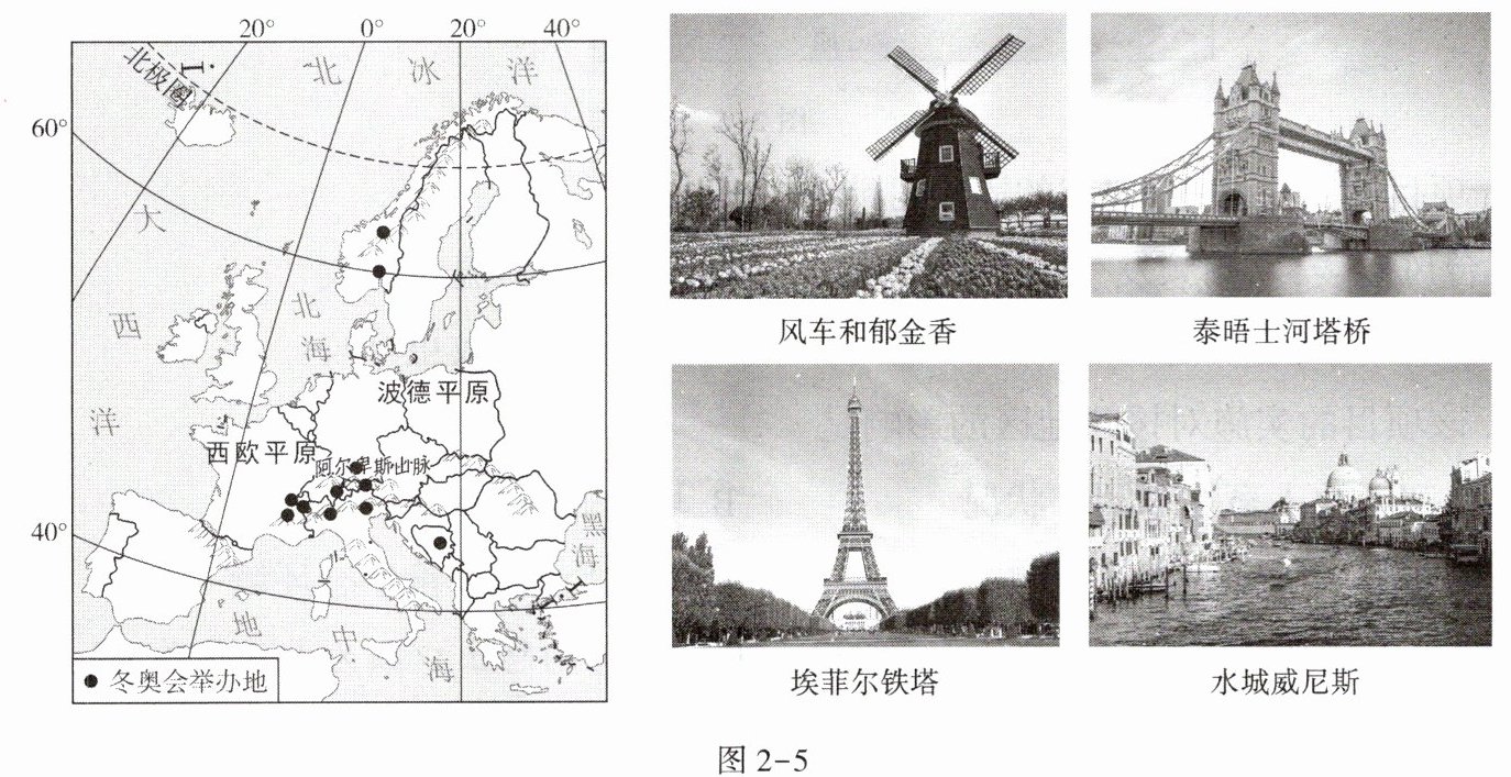 第25届冬季奥林匹克运动会将由意大利米兰和科尔蒂纳丹佩佐两个城市主办。在已经举办的24届冬季奥林匹克运动会中,欧洲西部共承办了13届,承办地平均雪期长达6个月。图2-5为欧洲西部历届冬奥会举办地分布示意图及欧洲西部旅游景观图。据此完成7~9题。