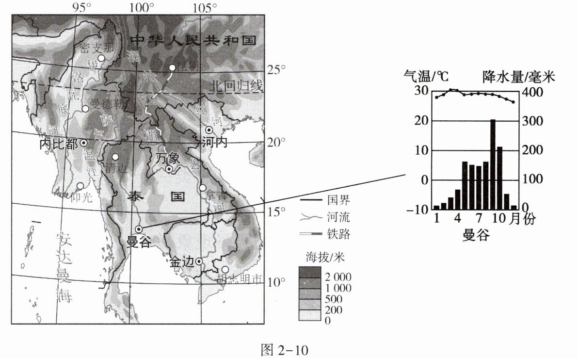 榴梿被誉为“水果之王”,深受我国消费者的喜爱。受气候条件影响,长久以来我国都需要从东南亚国家进口榴梿。图2-10为东南亚中南半岛地形示意图和曼谷气候统计图。
