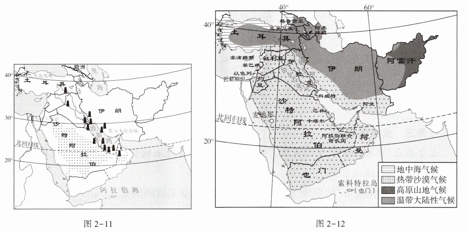 某中学地理兴趣小组围绕西亚开展项目式学习。图2-11为西亚石油分布示意图,图2-12为西亚气候类型分布示意图。请你和他们一起完成学习任务。