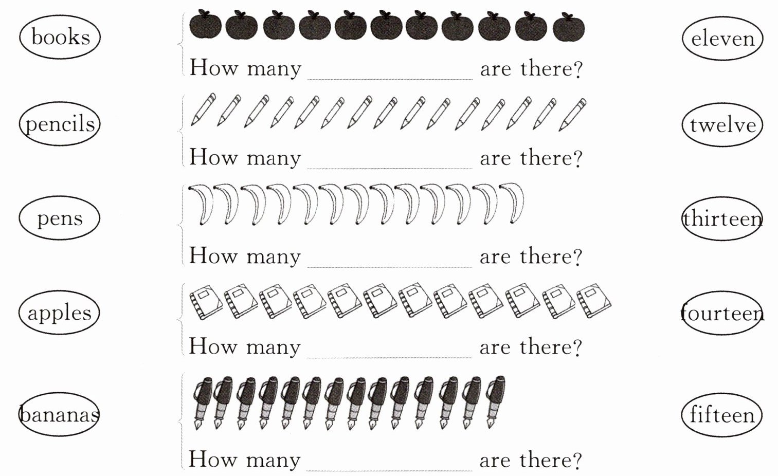 1. apples eleven 2. pencils fifteen 3. bananas thirteen