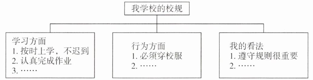 假设你叫李明,你打算向某学生英文网站投稿,介绍你学校的校规。请你根据思维导图内容提示用英文写一篇短文。
