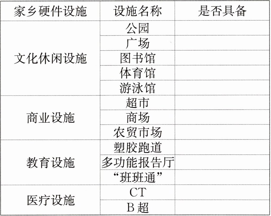 假设家乡有公园、广场、超市、商场、农贸市场、塑胶跑道、“班班通”、B超,没有图书馆、体育馆、游泳馆、多功能报告厅、CT。则表格填写如下: