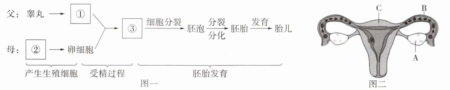 (1)图一中,睾丸产生①,①是____;卵细胞是由②产生的,②是____。