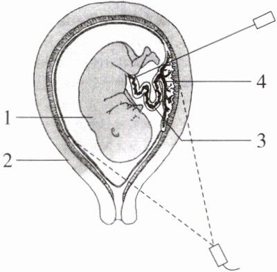 12. 小兰是一个青春洋溢的美少女,没有任何先天性疾病,她妈妈在怀孕期间,曾用PTC穿刺针在超声探头的引导下进行脐带穿刺取血,做过遗传病的早期检查。如图为子宫中的胎儿及脐带穿刺取血示意图,请据图回答下列问题。